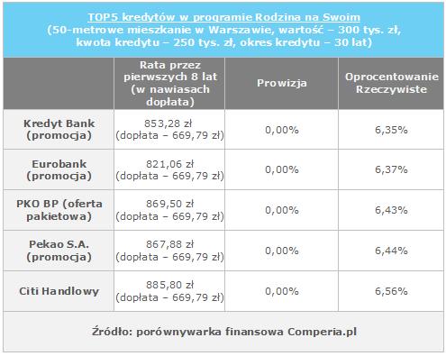 Na koniec warto przyjrzeć się aktualnie najlepszym kredytom w programie Rodzina na Swoim. Dla przyjętych warunków przez analityków Comperii najlepsze wydają się oferty promocyjne Kredyt Banku, Eurobanku i PKO Banku Polskiego. W poszukiwaniu zestawień zobowiązań w programie Rodzina na Swoim warto skorzystać z porównywarki finansowej Comperia.pl.