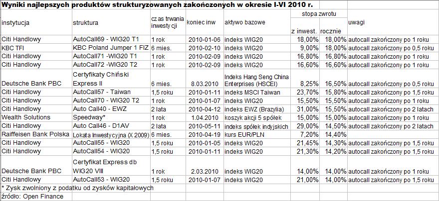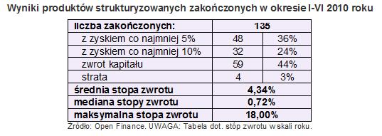 Średnia stopa zwrotu zakończonych w pierwszym półroczu 2010 roku produktów strukturyzowanych wyniosła ponad 4,3 proc. w skali roku. Najlepsze zbliżyły się do 20 proc. Takich wyników jeszcze nie było. Ponad 35 proc. zakończonych inwestycji w struktury dało stopę zwrotu co najmniej 5 proc. w skali roku (co można przyjąć za poziom bankowych lokat), a prawie co czwarty produkt przyniósł co najmniej 10 proc. per annum, co jest już wynikiem satysfakcjonującym.