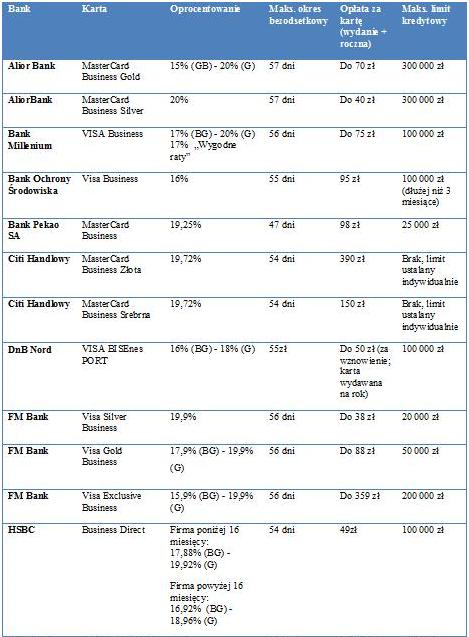 Coraz więcej banków włącza do swojej oferty karty kredytowe dla firm. Obecnie taki produkt w swojej palecie posiada 15 banków, w tym najmłodszy gracz na rynku ? FM Bank. W porównaniu z liczbą plastików w detalu nie jest to może wynik oszałamiający, ale taka ilość pozwala już wybierać. Wachlarz tych możliwości prezentuje poniższa tabela.