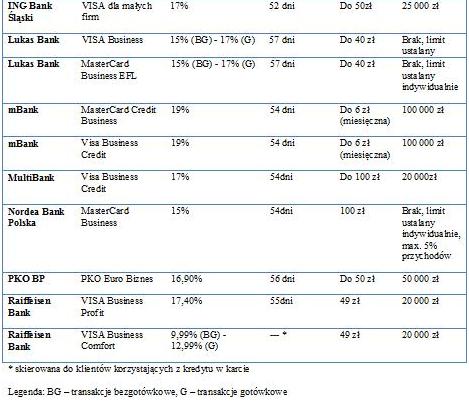 Najwięcej można pożyczyć z Alior Banku (300 tys. zł), najmniej z Raiffeisen Bank i MultiBanku (w obu przypadkach ? 20 tys. zł). Należy jednak pamiętać, że wysokość limitu ustalana jest indywidualnie na podstawie zdolności kredytowej klienta, tak więc górny próg może być osiągalny tylko dla nielicznych. Kartę z najniższym oprocentowaniem oferują Alior Bank, Lukas Bank i Nordea. Posiadaczom kart Visa Business Comfort, po przekroczeniu terminu bezodsetkowego, zostaną naliczone odsetki w wysokości 15 proc. Najdroższy kredyt (20 proc.) jest w Alior Banku i Banku Millenium. Średnia wartość oprocentowania waha się między 15 a 20 proc.