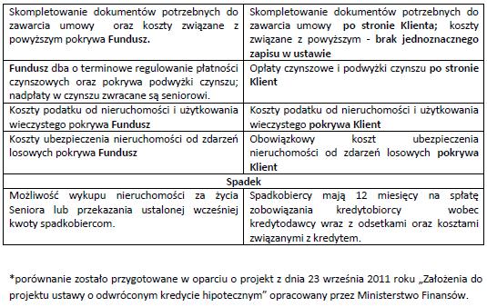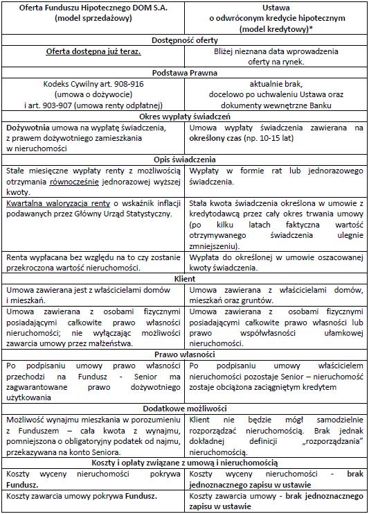 Zanim przejdziemy do porównań warto zaznaczyć, że porównujemy założenia do projektu ustawy dot. odwróconego kredytu hipotecznego z obecnie działającym na rynku modelem sprzedażowym. Co jest cechą wspólną modelu sprzedażowego i odwróconego kredytu hipotecznego? W obu przypadkach senior zbywający swój dom lub mieszkanie (nieruchomość), otrzymuje dodatkowe świadczenie, wypłacane co miesiąc lub w innych odstępach czasowych. Są to dodatkowe środki pieniężne do jego renty lub emerytury. Jakie są jednak różnice? Oferta Funduszy Hipotecznych gwarantuje dożywotnią wypłatę świadczeń, z prawem dożywotniego zamieszkiwania w nieruchomości, co więcej – wypłacana renta podlega najczęściej waloryzacji. Z założeń do projektu ustawy o odwróconym kredycie hipotecznym, wynika natomiast, że okres wypłaty świadczeń będzie z góry określony (świadczenia nie będą wypłacane dożywotnio). Po drugie, kwota ta zostanie określana z góry, a więc nie będzie podlegała waloryzacji.