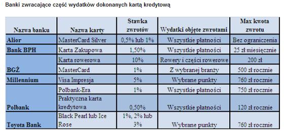 Na finansowe korzyści z płacenia kartą kredytową niezależnie od miejsca dokonania zakupów mogą również liczyć klienci Polbanku. W przypadku karty kredytowej ?Polbank-Era? zwracany jest 1% wydatków, jednak nie więcej niż 750 zł rocznie. Aby tą kartę otrzymać trzeba być klientem PTC, czyli posiadać telefon w sieci Era. Jeśli ktoś tego warunku nie spełnia może skorzystać z innej karty tego banku ? ?Praktycznej karty kredytowej?. W jej przypadku zwrot jest niższy, gdyż wynosi 0,5%. Niższe jest również ograniczenie maksymalnej sumy zwrotów – 120 zł rocznie.