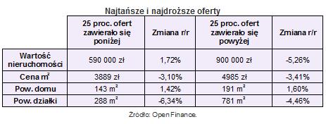 Deweloperzy wyraźnie spuścili z tonu w segmencie droższych domów. Tu cena najtańszej rezydencji to obecnie 900 tys. zł, co oznacza spadek o 50 tys. zł, czyli 5,3 proc., w stosunku do stanu sprzed roku. Jednocześnie o 1,6 proc. zwiększyła się powierzchnia oferowanych domów (ze 188 do 191 m2). Cena metra powierzchni domu spadła o 3,4 proc., do 4985 zł, zaś wielkość minimalnej działki oferowanej w tym segmencie rynku skurczyła się z 817,5 do 781 m2 (spadek o 4,5 proc.).