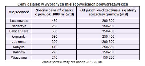 Przyjmijmy więc, że cena wykonania metra kwadratowego domu wyniesie 2100 zł/m2. Koszt ostateczny powinien więc zamknąć się w kwocie 365 tys. zł. Do tego oczywiście należy doliczyć koszt działki. Ich ceny są bardzo zróżnicowane, zależą przede wszystkim od lokalizacji i wielkości, ale także od uzbrojenia. W zależności od tych parametrów, koszt zakupu jednego metra działki budowlanej w jednej z satelickich dla Warszawy miejscowości. Warto zwrócić uwagę, że w siedmiu na osiem przytaczanych przez nas przykładowych miejscowości około warszawskich, w ciągu ostatnich siedmiu miesięcy ceny spadły, i to wyraźnie, bo najczęściej o 5 do 10 proc. W takich miejscowościach jak Nadarzyn, Wiązowna, Halinów czy Jabłonna, spokojnie znajdziemy działkę budowlaną o powierzchni ok. 1000 m2 w cenie do 250 tys. zł. W takim wariancie koszt ostateczny miałby szanse na zamknięcie się w okolicach 600-620 tys. zł. Jest to zatem mniej więcej równowartość mieszkania w Warszawie o wielkości 76,5 ? 79 m2.