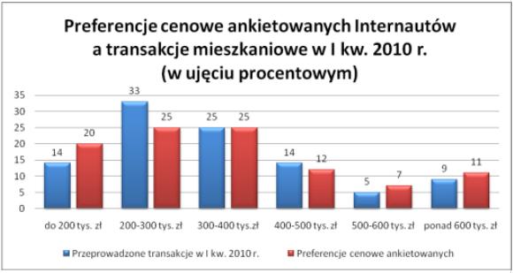 Na uwagę zasługują istotne rozbieżności w dwóch segmentach cenowych. W przedziale cenowym do 200 tys. zł przeprowadzono 14 proc. transakcji, z ankiety zaś wynika, że co piąta osoba jest zainteresowana zakupem mieszkania w tej cenie. Odwrotną sytuację obserwujemy w przedziale 200-300 tys. zł. W I kw. 2010 r. co trzecia transakcja mieściła się w tych kwotach, podczas, gdy ?tylko? 25 procent internautów deklaruje taki zakup. Mimo deklaracji 18 proc. ankietowanych o chęci zakupu mieszkania w cenie powyżej 500 tys. zł, odsetek transakcji w tym przedziale jest o kilka punktów procentowych niższy i wynosi 14 proc.