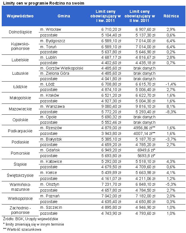 Znamy już limity cenowe w programie ?Rodzina na swoim? dla 13 województw. Póki co jedynie wojewodowie: podkarpacki, lubuski i opolski nie podjęli wiążącej decyzji w tej sprawie. Wbrew oczekiwaniom średni limit ceny m kw. kwalifikujący do rządowego wsparcia wzrośnie od 1 kwietnia o 2,2% dla miast wojewódzkich, a dla pozostałych obszarów o 0,6%.