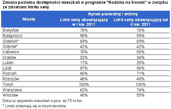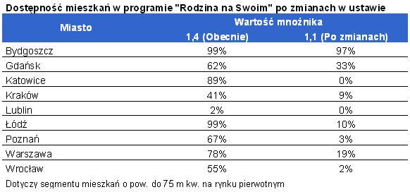 Byłoby tak na przykład w Katowicach, Lublinie, Poznaniu i Wrocławiu, gdzie maksymalnie kilka procent nowych mieszkań o powierzchni do 75 m kw. kwalifikowałoby się na limit cenowy programu. Byłby to powrót do początków obowiązywania ?Rodziny na swoim?, gdy zainteresowanie tą formą finansowania było śladowe. Nawet po zmianach wciąż byłyby jednak miasta, gdzie potencjalna rodzina miałaby do wyboru szeroką paletę lokali. Przykładem może być Bydgoszcz i Toruń, gdzie limit ceny przekraczałby 5,5 tys. zł za m kw., a średnia cena ofertowa jest obecnie o około tysiąc złotych niższa. W Warszawie natomiast pomimo czterokrotnego spadku liczby dostępnych mieszkań wciąż byłby to jeden lokal na pięć z oferty deweloperów.