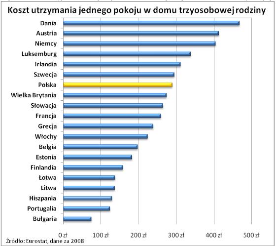 W Polsce przeciętna trzyosobowa rodzina wydaje aż blisko 16% domowego budżetu na utrzymanie nieruchomości. Miesięcznie jeden pokój wyciąga z kieszeni aż 289 zł. Plasuje to Polskę powyżej średniej dla Unii w gronie najdroższych krajów. Sytuacja ta wygląda jeszcze gorzej w Danii, Austrii i Niemczech, gdzie co miesiąc trzyosobowa rodzina wydaje na utrzymanie jednego pokoju ponad 400 zł miesięcznie. Należy jednak zauważyć, że w tych państwach dochody są blisko czterokrotnie wyższe niż w Polsce, przez co koszty utrzymania mieszkań są mniej dotkliwe dla budżetów przeciętnych rodzin.
