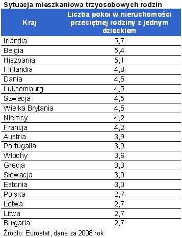 Wysokie koszty utrzymania nieruchomości w Polsce idą w parze z relatywnie gorszym standardem życia. Jak pokazują bowiem dane Eurostat przeciętna trzyosobowa rodzina ma do dyspozycji najmniejsze w Europie nieruchomości. Mają one przeciętnie zaledwie 2,7 pokoi. Dla porównania średnio w Unii są to 4 pokoje. Największe nieruchomości mają do dyspozycji rodziny w Irlandii, Belgii i Hiszpanii. Mieszkania trzyosobowych rodzin mają tam przeciętnie ponad 5 pokoi, czyli blisko dwukrotnie więcej niż w Polsce. Podobną do rodzimej sytuację mieszkaniową można odnaleźć w Bułgarii, na Litwie i Łotwie. Tak jak i Polska należą one do krajów rozwijających się i wywodzą się z dawnego bloku wschodniego.