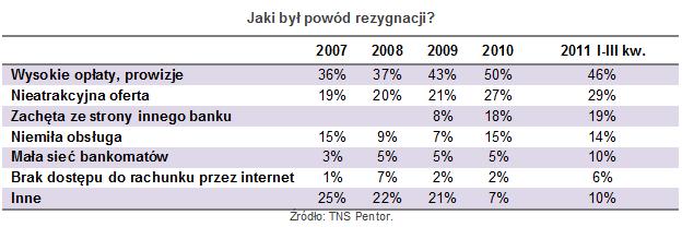 Jak podaje Pentor, wśród osób zastanawiających się nad zmianą, tylko 17 proc. to klienci, którzy mają konto w tym samym banku od co najmniej ośmiu lat. Sytuacja wygląda zupełnie inaczej w grupie ze stażem nieprzekraczającym dwóch lat. Z tej kategorii wywodzi się jedna trzecia osób, które zmieniały bank w ciągu ostatniego roku. Przyczyną odejścia jest głównie niezadowolenie ze współpracy. Taka odpowiedź uzyskuje 45 proc. wskazań. Ale czynnikiem koniecznym staje się też oferta konkurencji. To kluczowy element co drugiej tego typu decyzji ? zwraca uwagę Marcin Idzik.