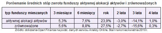 Stopy zwrotu funduszy aktywnej alokacji nie odbiegają zanadto w żadną stronę od wyników funduszy zrównoważonych. Z definicji fundusze aktywnej alokacji aktywów (AAA) mają aktywnie zarządzać powierzonymi im pieniędzmi, zmieniając poziom zaangażowania w poszczególne klasy aktywów (akcje i papiery dłużne) w zależności od bieżącej koniunktury rynkowej.