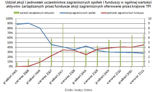 Jednak te znajdujące się w ofercie krajowych towarzystw funduszy inwestycyjnych w znacznej liczbie nie dokonują inwestycji bezpośrednio na konkretnych rynkach. Wg ostatnich dostępnych danych, największy, bo ponad 45-proc. udział w ich portfelach mają bowiem jednostki uczestnictwa innych funduszy, których siedziba znajduje się poza granicami Polski. W ten sposób zainwestowały przeszło 3,1 mld zł (z tego ok. jednej dziesiątej w ETF-y). Z kolei bezpośrednio w akcjach zagranicznych przedsiębiorstw ulokowały blisko 28 proc., czyli ok. 1,9 mld zł aktywów.