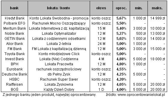 Poniżej prezentujemy zestawienie piętnastu najwyżej oprocentowanych produktów bankowych (lokat i kont) z codzienną kapitalizacją odsetek. Warto zwrócić uwagę na górne pułapy kwotowe, ustawione dla większości z nich. W ten sposób banki zabezpieczają swoich klientów, aby nie przekroczyli progu, przy którym dzienne odsetki przewyższą 2,49 zł i zyskami trzeba się będzie podzielić z fiskusem.