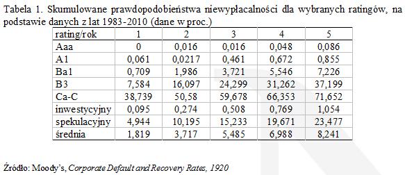 Zobaczmy więc jak wyglądają przykładowe dane udostępniane przez agencję Moody?s. Tabela nr 1 pokazuje skumulowane prawdopodobieństwa niewypłacalności w okresie od 1 do 5 lat dla spółek o wybranych ratingach.