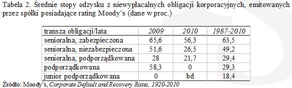 Tabela nr 2 przedstawia zaś średnie stopy odzysku dla obligacji umieszczonych w różnych pozycjach w hierarchii struktury długu w przedsiębiorstwie. Warto zauważyć, że stopy odzysku szacowane są nie na podstawie realnie odzyskanych środków, tylko na podstawie cen obligacji zaobserwowanych 30 dni po niewypłacalności, przyjmuje się tym samym, że na względnie płynnym i efektywnym rynku, ceny te wiernie odzwierciedlają zdyskontowane, przyszłe przepływy z tytułu odzysku wierzytelności.