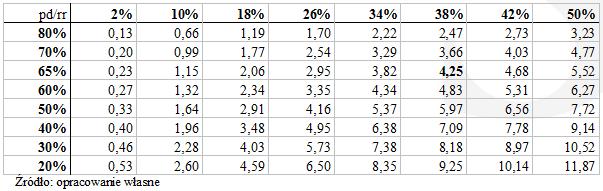 Tabela 3. Oczekiwana strata/implikowana premia za ryzyko (dane w punktach procentowych) w okresie rocznym w zależności od skumulowanych prawdopodobieństw niewypłacalności (ang. probability of default ? pd, oś pionowa) w okresie 3 lat i stóp odzysku (ang. recovery rate ? rr, oś pozioma).