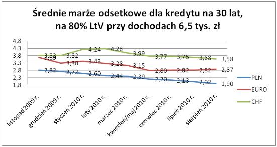 Niewykluczone, że swój wkład ma tu Komisja Nadzoru Finansowego, planująca nowelizację Rekomendacji S. Nadzór chce w przyszłym roku zakazać bankom, mającym już ponad połowę kredytów udzielonych w walucie, dalszego finansowania nieruchomości w euro czy franku. Naciska tym samym na zwiększenie w wielu instytucjach finansowych zaangażowania właśnie w kredyty złotowe. W efekcie w sierpniu ofertę kredytów złotowych zaczęły mocno uatrakcyjniać takie banki jak DnB Nord (spadek marży z 1,9 do 1,7 proc.), BPH (spadek marży z 4,8 do 1,7 proc.), czy DB PBC, wcześniej skoncentrowane na kredytach walutowych. Już w lipcu podobny ruch wykonała ?walutowa? Nordea. Bank BPH zdecydował się nawet dla kredytów złotowych podnieść relację kredytu do wartości nieruchomości z 80 do 96 proc., jednocześnie pozostawiając LTV dla walut na poziomie 80 proc.