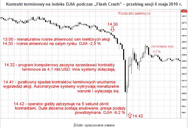 Śledztwo amerykańskiej Komisji Giełd Papierów Wartościowych (SEC) wykazało, że przyczyną tzw. flash crash, czyli załamania cen na nowojorskiej giełdzie podczas sesji 6 maja 2010 roku była łańcuchowa reakcja systemów komputerowych na omyłkowe zlecenie. Firma Waddell&Reed Financial z Kansas, w wyniku błędu automatu transakcyjnego ok. godz. 14.30 przystąpiła do zamykania pozycji w kontraktach terminowych wartej 4,1 mld USD. Kilkanaście minut później indeks DJIA znalazł się o 9,2 proc. poniżej poziomu z poprzedniej sesji, a z szerokiego rynku akcji wyparowało ok. bilion dolarów prawdziwych, nie wirtualnych pieniędzy. Tego dnia na rynek nie napłynęły ani szokujące wiadomości, ani rozczarowujące wyniki spółek ? po prostu programy nie znające emocji, towarzyszących zwykłym inwestorom, otrzymały mylące dane wejściowe. Początkowo, gdy indeks Dow Jones Industrial Average poruszał się ok. 2,5 proc. poniżej zamknięcia poprzedniej sesji, automatyczne systemy, podobnie jak każdego innego dnia, wykonywały swoje zadania i pracowały zgodnie ze zdefiniowanymi z góry warunkami. Duże zlecenie sprzedaży (w praktyce było to wiele pojedynczych, mniejszych zleceń wysyłanych co kilkadziesiąt milisekund przez anonimową dla reszty inwestorów firmę) spowodowało, że grające z krótkoterminowymi trendami (w tym przypadku jako długi termin uznaje się już nawet kilka minut) także pozbywały się akcji lub otwierały krótkie pozycje w kontraktach terminowych.