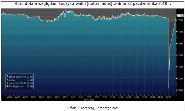 Jeśli ktoś uważa, że system finansowy działa prawidłowo tylko dlatego, że gazety i telewizja nie biją na alarm, że coś jest nie tak, jest w błędzie. Automaty obecne są niemal na każdym rynku i systematycznie toczą ze sobą wojny na skuteczność i szybkość algorytmów. 22 października na rynku walutowym obserwowaliśmy mini-krach, ale na szczęście miało to miejsce po zakończeniu regularnej sesji na Wall Street i systemy skorelowane z kursem dolara były już wyłączone. W ciągu kilkudziesięciu sekund dolar błyskawicznie osłabił się względem koszyka walut ? kurs dolarowego indeksu spadł z 77,6 do 74,6 pkt. W tym przypadku sprawa jest znacznie bardziej zastanawiająca, ponieważ mówimy o rynku walutowym, na którym z definicji płynność jest niemal nieograniczona.
