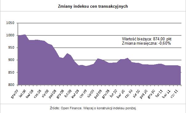 Od tego czasu indeks kilkakrotnie zyskiwał na wartości, wychodząc nawet ponad pułap 900 pkt. Jednak od maja ubiegłego roku ? z drobnymi przerwami ? systematycznie zmniejsza swoją wartość. Wskaźnik, powstający na bazie transakcji przeprowadzanych przez klientów Open Finance i Home Broker w 16 największych polskich miastach, jest obliczany od początku 2008 roku. Jego historia sięga więc ponad 3,5 roku. Jego wartość początkową wyznaczyliśmy na 1000 pkt., zatem w tym czasie stracił 12,6 proc.