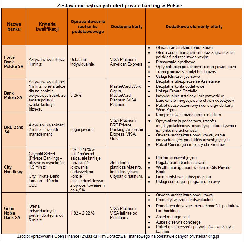 Choć aby skorzystać z oferty personal lub private banking za granicą wymagane są o wiele wyższe dochody i bardziej wartościowe aktywa, w Polsce także należy wykazać się niemałym majątkiem. Poniższa tabela przedstawia zestawienie wybranych banków oferujących usługi private banking. Zostały one dobrane pod kątem wysokich kryteriów kwalifikacyjnych i interesujących składników oferty.